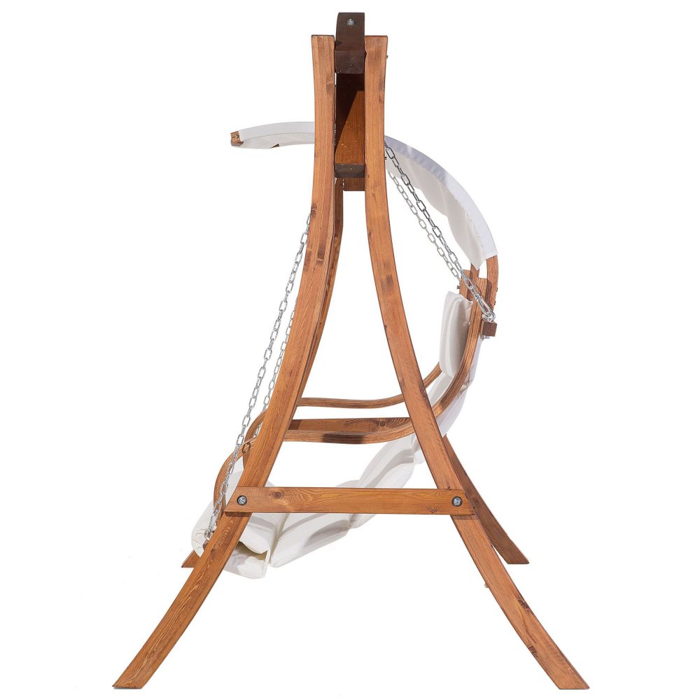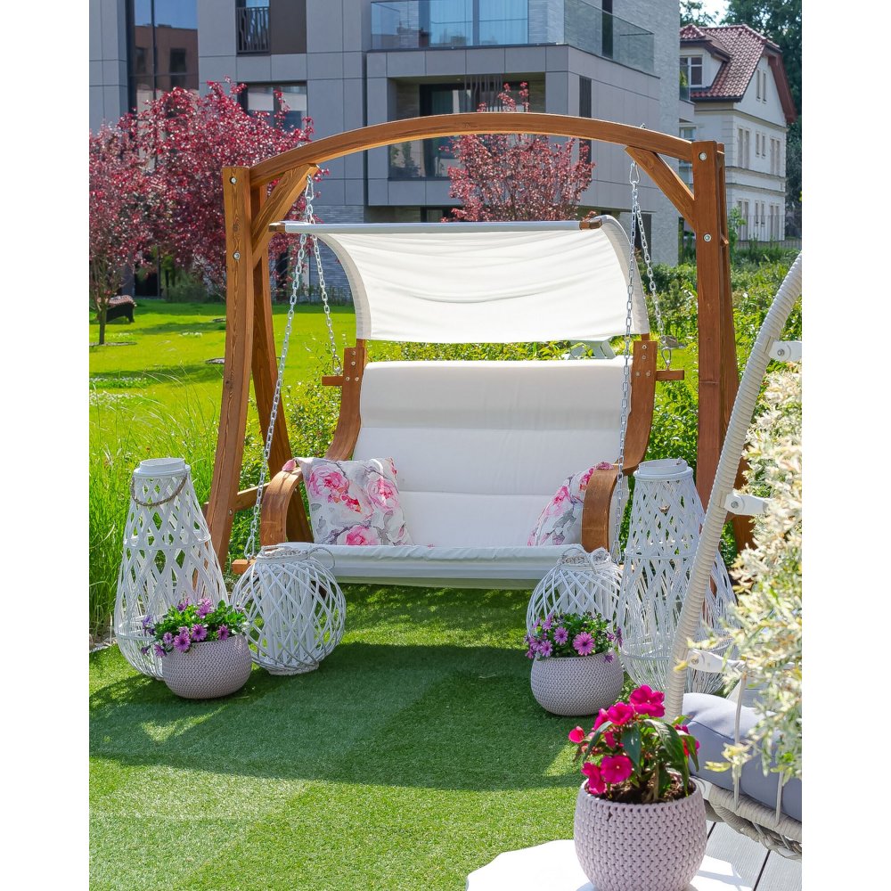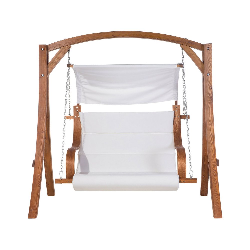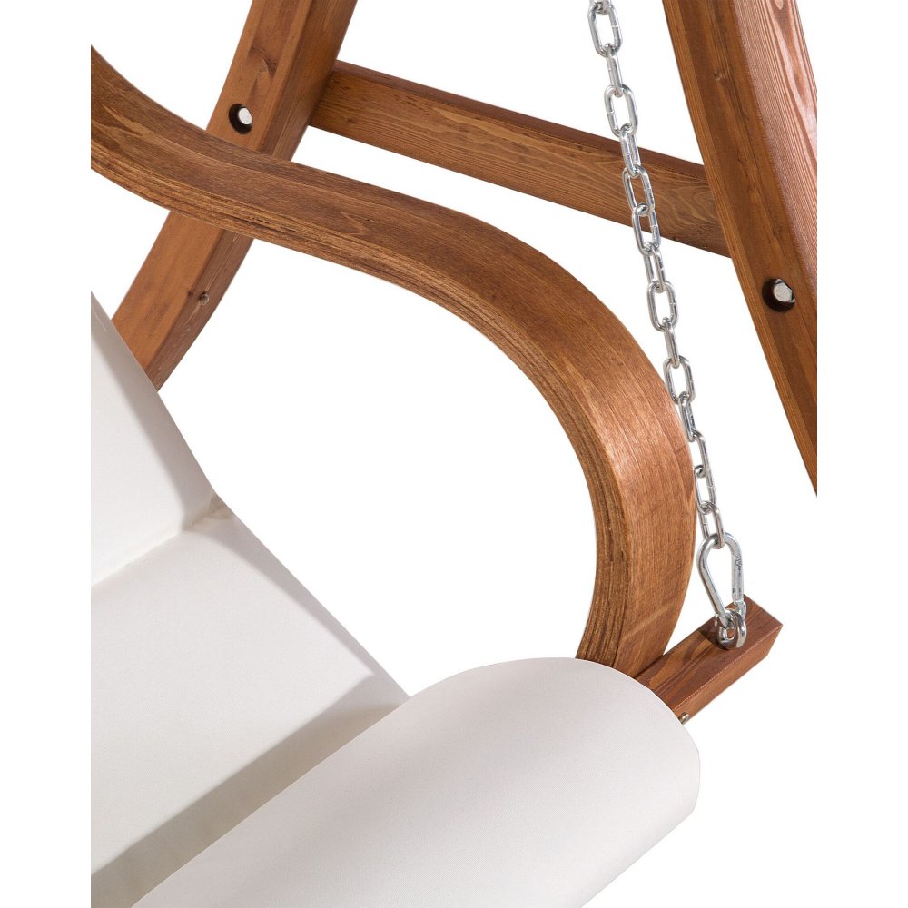 Questo eccezionale dondolo da giardino aggiunge un'atmosfera affascinante a qualsiasi giardino! Il design unico e la forma leggermente curva si combinano con un'elevata funzionalità. La struttura in legno per tutte le stagioni è resistente ed è disponibile in una calda finitura in teak che accentua la tappezzeria bianca. Il rivestimento del sedile di facile manutenzione può essere pulito con una spugna umida. E' eccezionalmente stabile e confortevole. Una catena e clip di sospensione sono realizzate in acciaio.